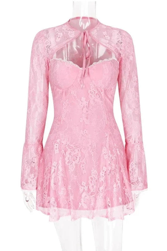 A-Line Mini Dress with O-Neck, High Waist, Long Sleeves, and Lace-Up Detail