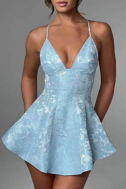 A-Line Deep V-Neck Sleeveless Mini Dress with Spaghetti Straps and Backless Design